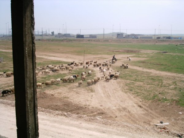 Title: SHEEP HERD FOLLOWING A DONKEY